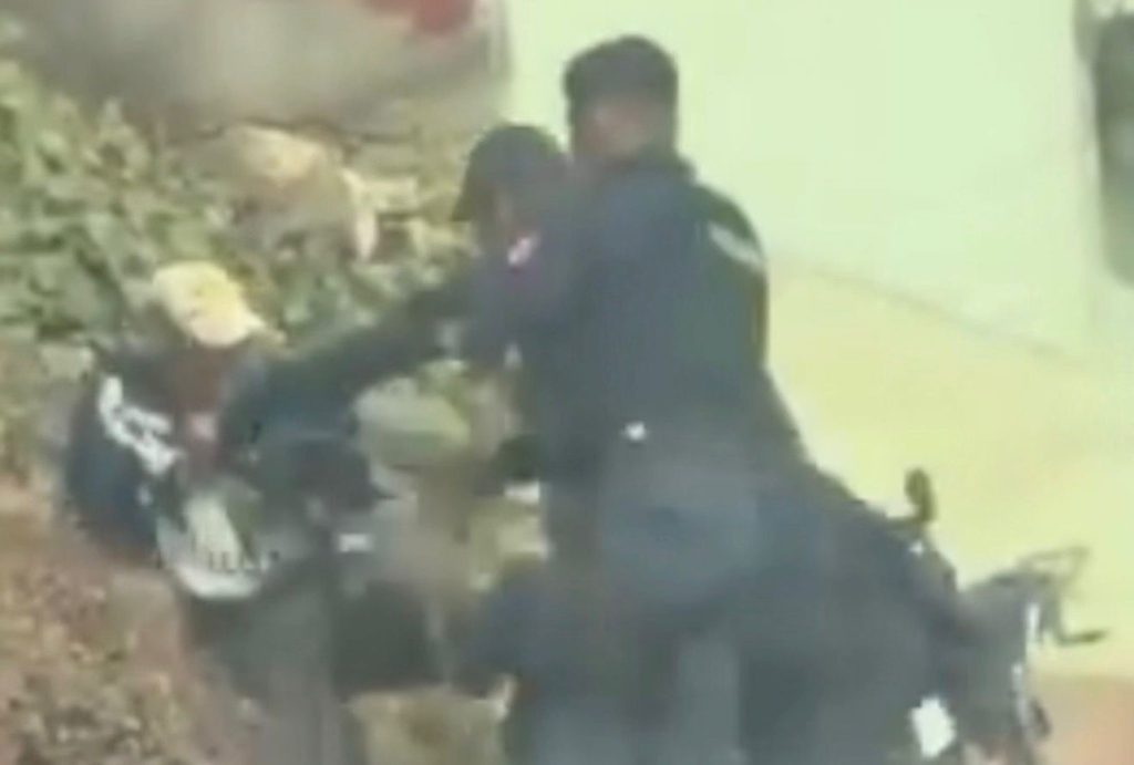 Las imágenes también muestran a otro civil que, aparentemente, intenta intervenir y es amagado por un uniformado con un objeto metálico. Ante la escena, algunas personas que presenciaban los hechos sacaron machetes para encarar a los policías y exigir que cesara la agresión.